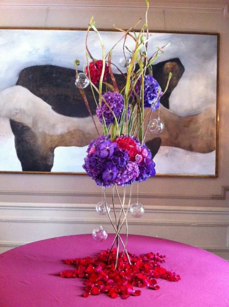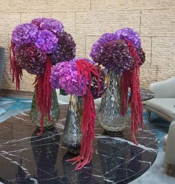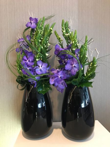 Kompozycja kwiatowe we wnętrzach hotelowych, fiolet połączony z błyszczącą czernią, zielony słoń
